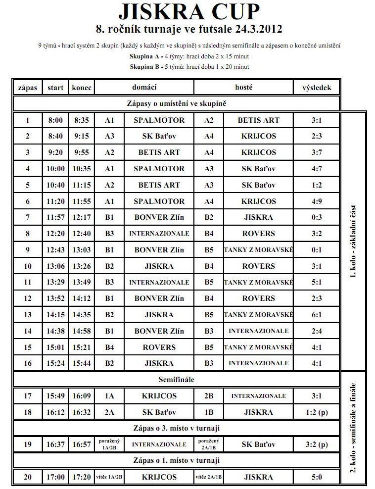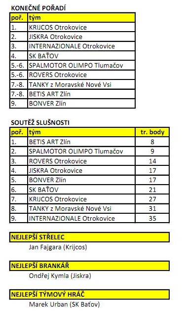 Herně náš tým nezklamal, ale bohužel si ze tří zápasů nepřipsal ani bod. Se svými sooupeřemi jsme drželi krok, ale poslední dvě minuty, to byla černá můra. Nejprve jsme nezvládli koncovku se Spalmotorem Tlumačov, když jsme nakonec podlehli 1:3. O jedinou naši přesnou trefu se postaral Radek Machů. V dalším utkání s několikanásobným vítězem tohoto turnaje Krijkosem jsme ještě ke konci živili náděj na dobrý výsledek. Za stavu 3:4 jsme se pokusili vyrovnat, jenže naopak jsme dostali další góly a prohráli 3:7. O naše branky se postarali Radek Machů, Milan Hozík a Viktor Šimeček. V posledním utkání ve skupině s SK Baťov jsme ještě bojovali o postup, ale nakonec jsme opět brankou v posledních vteřinách prohráli 1:2, když naši jedinou trefu zaznamenal Daniel Frank.